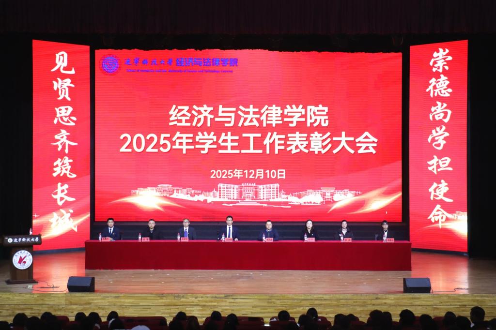 12月10日,经法学院在校礼堂隆重举行2025年度学生工作表彰大会。会议由经法学院党委书记赵智博主持,院长郭浩淼、党委副书记张国华、副院长邵玲、副院长温馨、金融科技系主任郭威、学办主任李路云、团委书记张鹏飞及2023、2024、2025级全体学生参加。