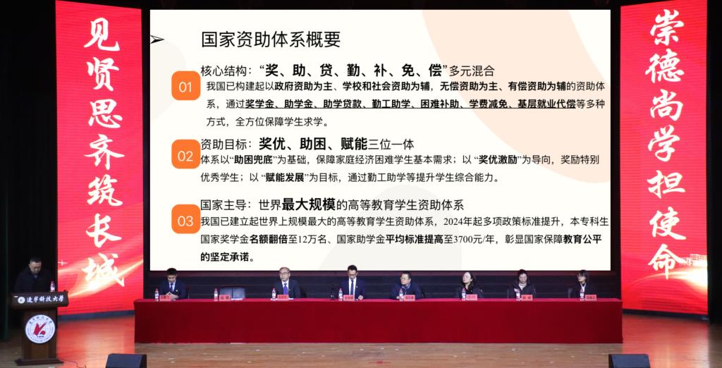 在资助政策宣讲环节,温馨副院长围绕本科生国家资助体系,系统介绍了“奖、助、贷、勤、补、免、偿”多元资助模式。他重点讲解了国家奖学金、国家励志奖学金、助学金等主要资助项目的申请条件及最新标准,并详细解读了国家助学贷款的贷款额度、偿还期限及利息补贴等政策内容。同时,他提醒同学们保持警惕,远离非法“校园贷”,并介绍了勤工助学、困难补助等辅助性资助措施,为学生解决经济困难提供更多渠道。