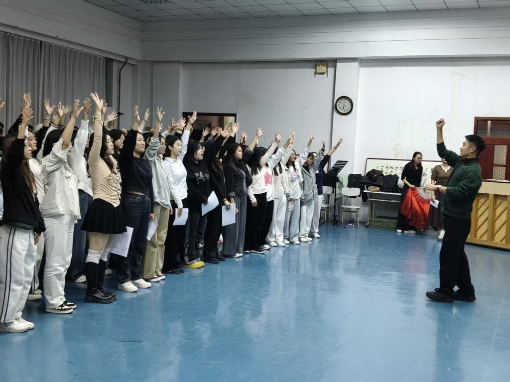 在一个多月的备赛过程中,合唱团成员们在院团委书记张鹏飞以及艺术学院专业教师林晨、姜华的悉心指导下,全情投入、刻苦训练。备赛初期,指导老师针对声部基础、气息控制、音准把握等核心要素进行系统教学,为合唱团打牢专业基础;中期训练中,老师们逐段分析曲目结构,从情绪渲染、节奏统一到声音层次的呈现进行逐一示范与纠正。进入赛前强化阶段,张鹏飞老师亲自把关整体效果,对每一次合唱进行细致点评,并对站位调整、眼神交流、舞台表现等细节提出针对性优化意见。在学院学生会文化活动部的统筹安排下,成员们充分利用课余时间持续练习,相互配合、不断磨合,用坚持与汗水诠释对艺术的追求,也用真挚情感表达对祖国的深沉热爱。