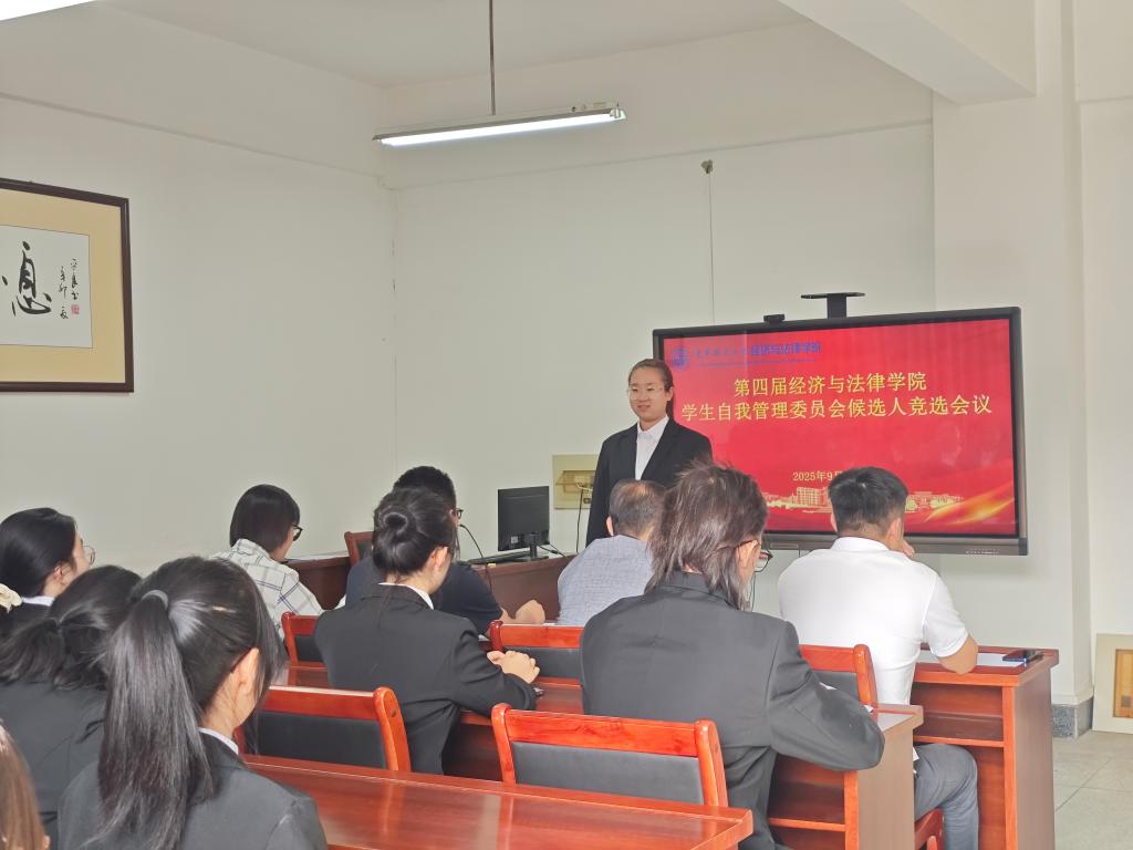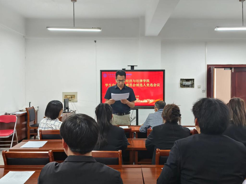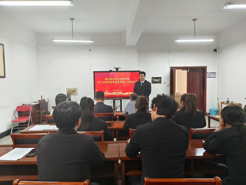 9月17日下午,经法学院于博识楼A313召开经法学院大学生自我管理委员会(以下简称“自管会”)换届竞选会议。会议由经法学院党委副书记张国华主持,学院党委书记赵智博、学办主任李路云以及团委书记张鹏飞出席会议,共有24名同学参与竞选。