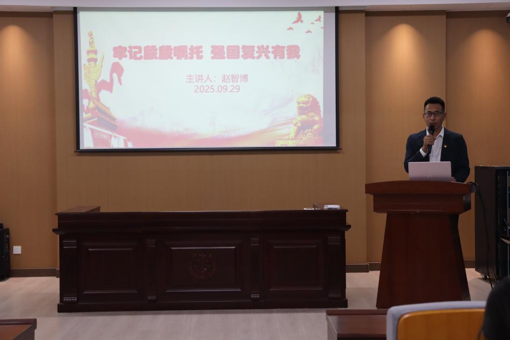 学院党委书记赵智博以“牢记殷殷嘱托,强国复兴有我”为主题开展宣讲。从担负历史重任、弘扬爱国情怀,到维护世界和平、推进复兴伟业,他深入阐述了中国人民抗战胜利80周年的时代启示。赵书记鼓励广大青年学子要承先辈之志,以奋斗为笔、以汗水为墨,坚定不移听党话、跟党走,在强国建设和民族复兴的火热实践中绽放青春绚丽之花。