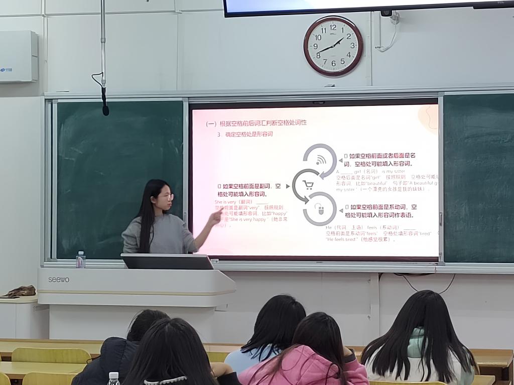 首先,金融232班尹红霄同学以英语四级550+的优异成绩,为同学们开展英语阅读专项指导。她系统讲解了“判词性”“识后缀”“定答案”三大核心技巧,分享了长篇阅读定位方法及标点符号在解题中的实用技巧,帮助同学们掌握科学解题思路,提升阅读答题效率。