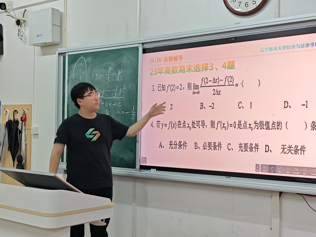 随后,金融231班李诗哲同学凭借高数成绩90+的扎实功底,聚焦导数应用模块开展教学。他从导数核心定义出发,围绕导数形式、切线与法线方程、隐函数求导等知识点进行细致讲解,并结合真题演练帮助同学们巩固所学内容,有效梳理知识脉络,助力大家攻克导数学习中的重点难点问题。