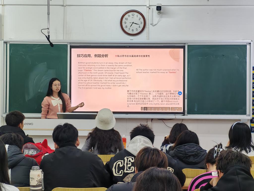 金融232班尹红霄同学以581分优异成绩通过英语四级考试,同时担任学校的帮帮团英语教员。她带着现场同学一起拆解了2套四级真题里的长篇阅读,与大家一步步用“定位查找”“核对信息匹配”“重视标点”的方法找关键词、匹配段落,最后总结这类题的常见陷阱。她指出多刷真题的重要性,为同学们的英语学习指明了方向。