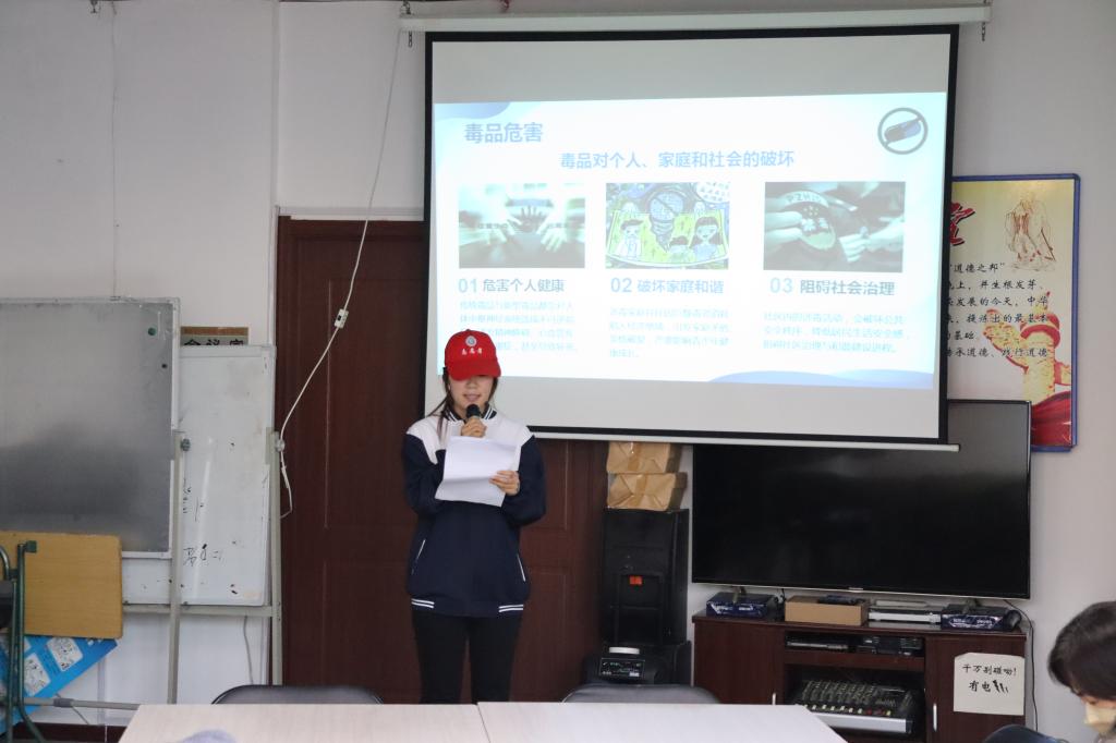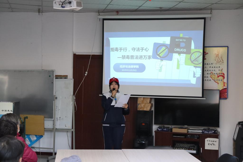 随后,法律协会成员范蒙蒙同学对《中华人民共和国禁毒法》《中华人民共和国刑法》中关于毒品管制及相关违法犯罪责任的重点条款进行了系统讲解。她详细介绍了传统毒品与新型毒品的识别要点、常见诱骗方式及日常防范措施,强调“禁毒工作,人人有责”,号召居民以法律为准绳,以责任为行动指南,自觉抵制毒品侵害,主动参与到禁毒斗争中来。最后,于震从日常行为规范远离毒品、毒贩方面,为居民们普及了相关行政法知识。