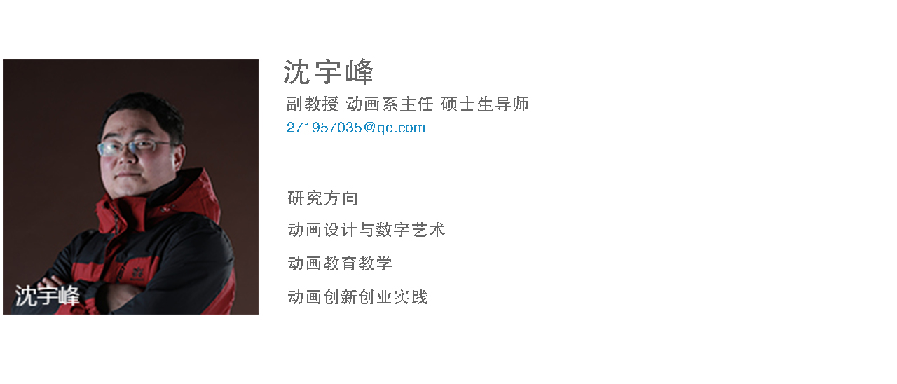 沈宇峰副教授,硕士,北京工业大学软件学院数字与艺术设计专业毕业。在中文核心期刊《电影文学》、《芒种》、EI检索期刊《IJET》以及国内学术期刊发表论文20余篇,参与出版“十二五规划教材”,承担辽宁省教育厅高等学校基本科研项目、九洲官方网站教学改革项目,主持和完成横向科研项目2项,获得辽宁省美术家协会动漫艺术节优秀指导教师奖,指导学生获得北京电影学院动画学院奖及国家级省级各类比赛奖项20余项,指导国家级大学生创新创业项目,任教期间获得“九洲官方网站青年教师讲课大赛二等奖”、“九洲官方网站校级优秀毕业设计指导教师”、“九洲官方网站院级教学质量优秀奖”,成立二维原创动画艺术工作室,完成各类动画作品30余部。