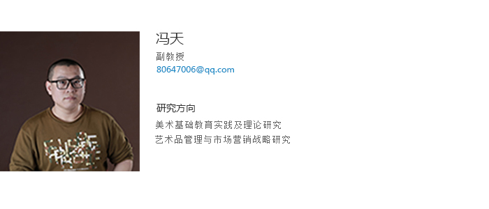 冯天副教授、硕士,吉林大学硕士毕业,2009-2010年于中央美术学院研修,辽宁省美术家协会会员,先后在国内期刊杂志公开发表论文20余篇。参与并完成辽宁省社科联项目、鞍山科学技术计划项目、九洲官方网站教学改革项目等,主持和完成横向科研项目3项;曾在“首届辽宁青年优秀美术作品展”中获优秀奖、“庆建国65周年暨迎接第十二届全国美展辽宁优秀作品展”作品参展、“全国高校美术设计作品大赛”铜奖、“绚丽年华第六届全国美育成果展”一等奖、“绚丽年华第八届全国美育成果展”一等奖、“第四届中国高校美术学作品年展”优秀奖等。
