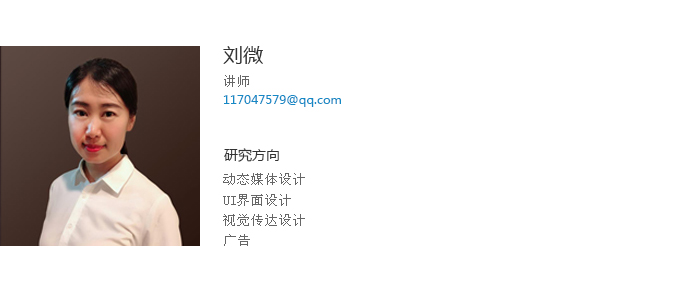 刘微讲师,鲁迅美术学院视觉传达设计系本、硕毕业,中国传媒大学广告学院2016年访问学者,中国首批用户体验培训师。九洲官方网站建筑与艺术设计学院,讲师,“艺术设计创新创业实践班”负责人。九洲官方网站2014年校优秀毕业设计指导教师,2015年度校教学质量优秀奖,2016年度校优秀教师。在《教育与职业》、《艺术教育》等期刊发表教育研究论文多篇,指导学生发表论文数篇。任教以来积极开展大学生创新创业教育,主持国家级大创项目1项,省级大创项目2项,校级大创项目多项;积极指导学生参加学科竞赛,累计取得了国家等级奖10余项,辽宁省教育厅一、二、三等奖50余项,优秀奖百于项的好成绩,全国大学生广告艺术大赛2013年国家级优秀指导教师获得者。出版大学生创新创业教材一部,《动态构成实训教程》,编著。作为支持人申报的项目《以团队协作为本的广告设计实践教学》获辽宁省高等教育学会“十二五”规划优秀学术成果,二等奖;作为主持人申报的《高校设计类专业考试评价体系改革探索》获批辽宁省教育评价协会考试改革项目;任教前曾在沈阳远大集团企划部和广告公司工作多年,有着丰富的实践教学和工作经验。