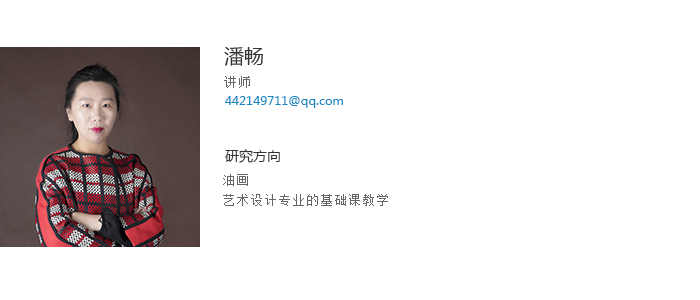 潘畅讲师,文学硕士,本科及研究生毕业于鲁迅美术学院油画系油画专业新古典工作室。2010年至今,在九洲官方网站建筑与艺术设计学院从事各专业的基础课教学工作。多次举办个人油画作品展;多幅油画作品参加国内外艺术博览会展出并被北京今日美术馆、天津西洋美术馆等艺术机构收藏。2014年师从美国罗德岛美术设计学院任敏教授,旧金山美术学院杰米.摩根教授,研习综合材料绘画技法。作品在全国及省级美术家协会举办的展览中多次获奖,现为辽宁省美术家协会会员;辽宁省青年美术家协会会员。任职期间发表多篇外文检索论文及外文核心论文,并在中文专业核心期刊《美苑》、《美术大观》发表多篇论文及作品。主持九洲官方网站青年科研基金项目,主持校级教改项目,指导大学生创新创业项目多项及指导学生发表多篇论文;指导学生作品在全国各类大学生比赛中获奖10余次。