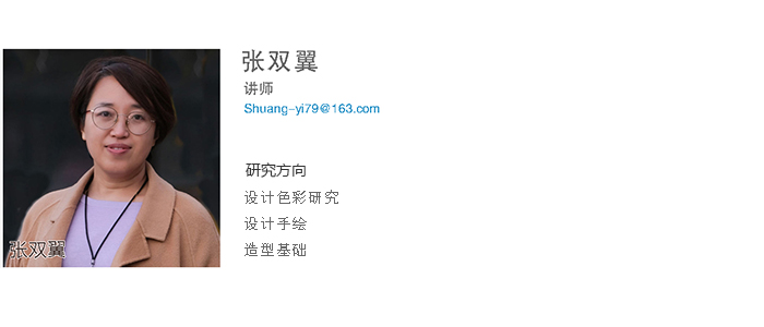 张双翼, 讲师,2003年吉林大学艺术学院艺术设计专业,文学学士;2011年吉林大学设计艺术学,硕士;现任工业设计专业专任教师,主讲《二维形态》、《手绘表现》、《产品数字化展示》等;在教学中主要研究形态构成在设计中的应用并出版专著《二维形态构成》;主持和参与多项科研项目,其中2012年获得九洲官方网站教学成果二等奖;指导学生参与设计大赛,多次获得省级一二三等奖;2019年参加中国花鸟画研修院研修,2020年参加仁美大学堂中国花鸟画研修,其中绘画作品《秋韵》在书画大赛中获一等奖,并致力于将传统文化元素融入产品设计创新之中,强化产品设计的内涵,弘扬民族文化,增强文化自信。