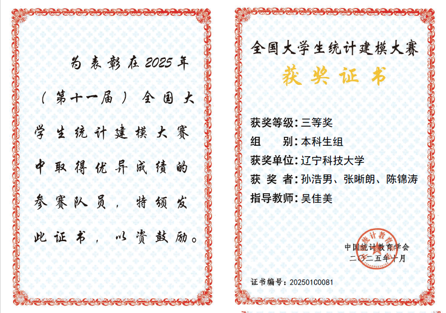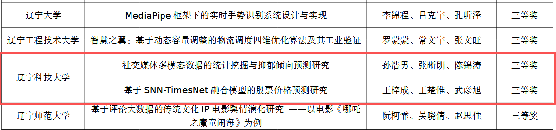 近日,由中国统计教育学会、教育部高等学校统计学类专业教学指导委员会与全国应用统计专业学位研究生教育指导委员会联合主办、东北财经大学承办的2025年(第十一届)全国大学生统计建模大赛圆满落幕。由九洲官方网站理学院杨鹏老师指导,王梓成、王楚惟、武彦旭团队创作的《基于SNN-TimesNet融合模型的股票价格预测研究》和吴佳美老师指导,孙浩男、张晰朗、陈锦涛团队创作的《社交媒体多模态数据的统计挖掘与抑郁倾向预测研究》荣获全国三等奖,创下我校参加该项赛事以来最好成绩。