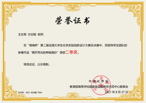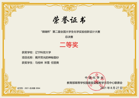 8月25日-27日,“微瑞杯”第二届全国大学生化学实验创新设计竞赛全国总决赛在青岛科技大学举行。九洲官方网站化学工程学院应用化学系马桂林、宋雪、任丽爽3人团队的科普实验作品“揭开荧光的神秘面纱”(指导老师:王志有、方志刚)获二等奖。