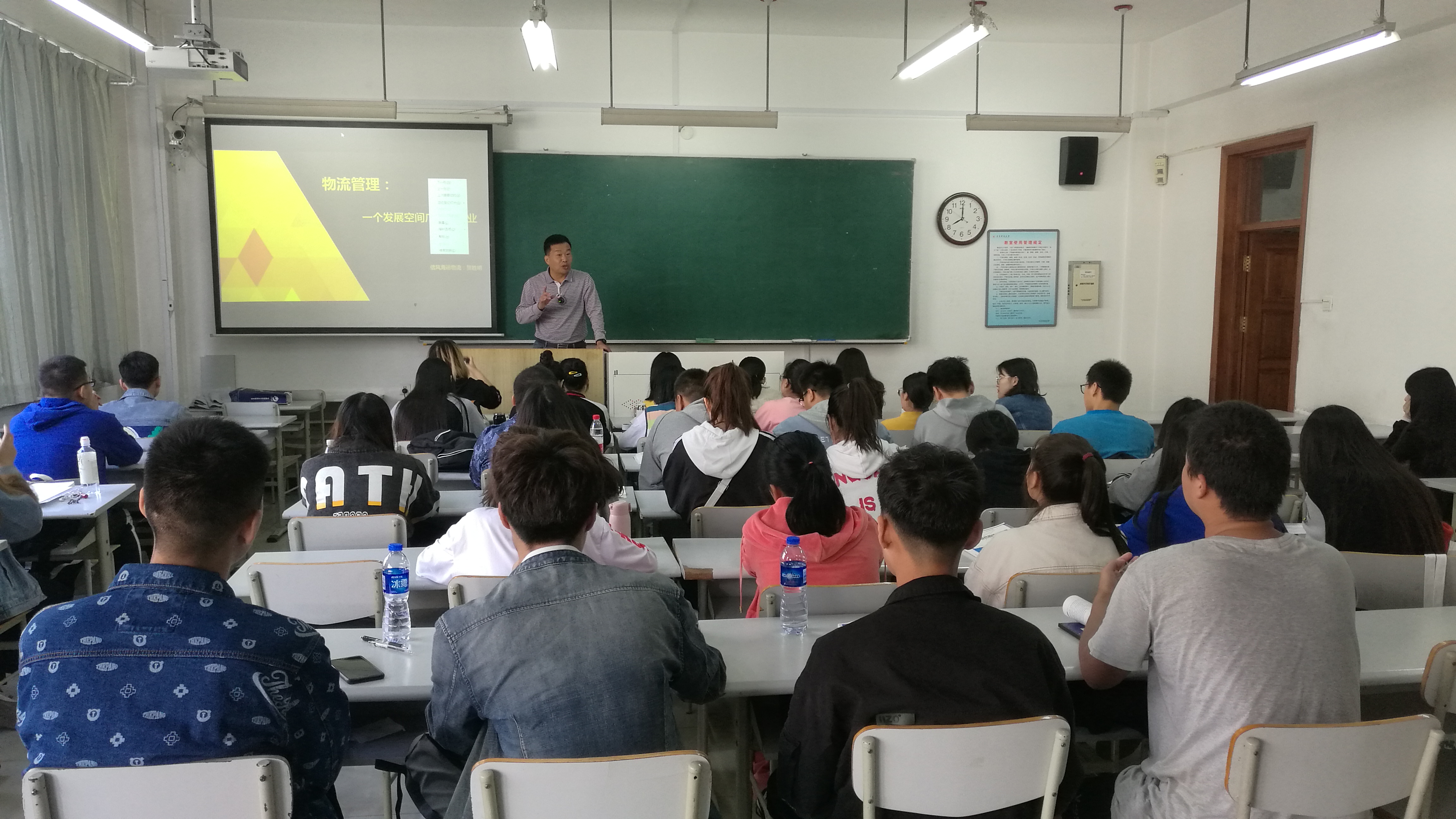 受到工商管理学院《物流管理》课程组的邀请,信风海运物流集团董事长助理贺胜明先生于本周三走进了《物流管理》课程的课堂,为工商2018级同学们开展了一次精彩的企业家进课堂教学活动。贺胜明以《物流管理:一个发展空间广阔的产业》为题,首先介绍了现代物流的范畴,紧接着用汽车物流、工厂物流、一带一路、香港利丰集团、鞍钢、巴基斯坦卡拉奇港等用大量国内外生动案例为同学们介绍了物流管理的职业发展潜力和巨大空间。课堂上,贺胜明与同学们开展了大量的互动教学,同学们表现出了浓厚的学习兴趣。课程结束前,同学们向贺胜明咨询了职业生涯规划问题,贺胜明一一作了解答。贺胜明诚邀同学门下一步可以走进信风海运物流集团,到营口港基地实地参观学习。