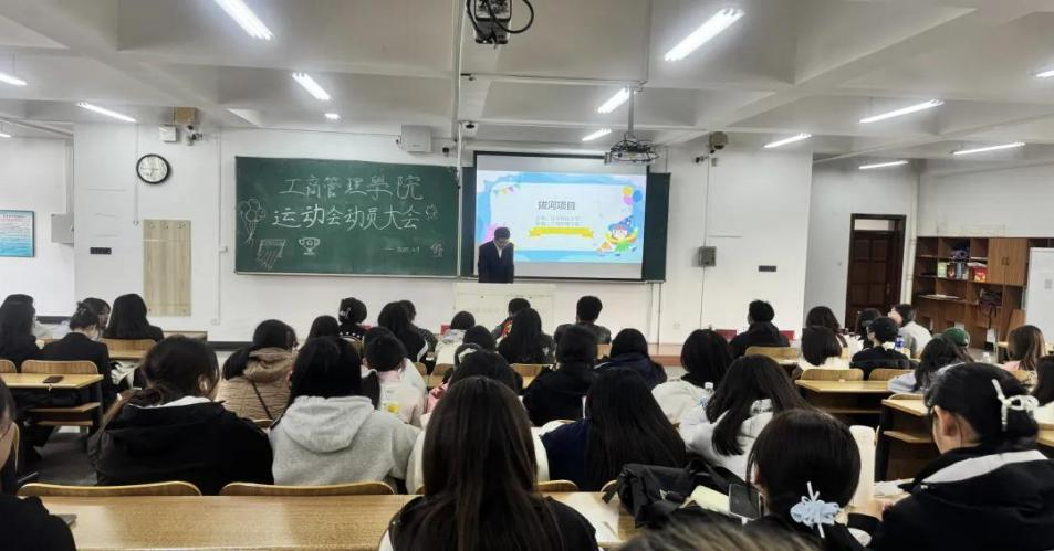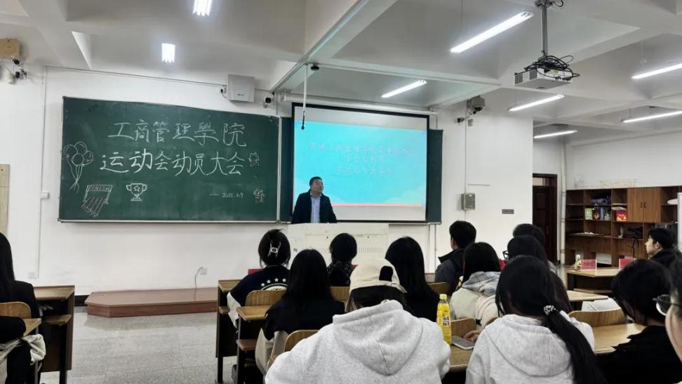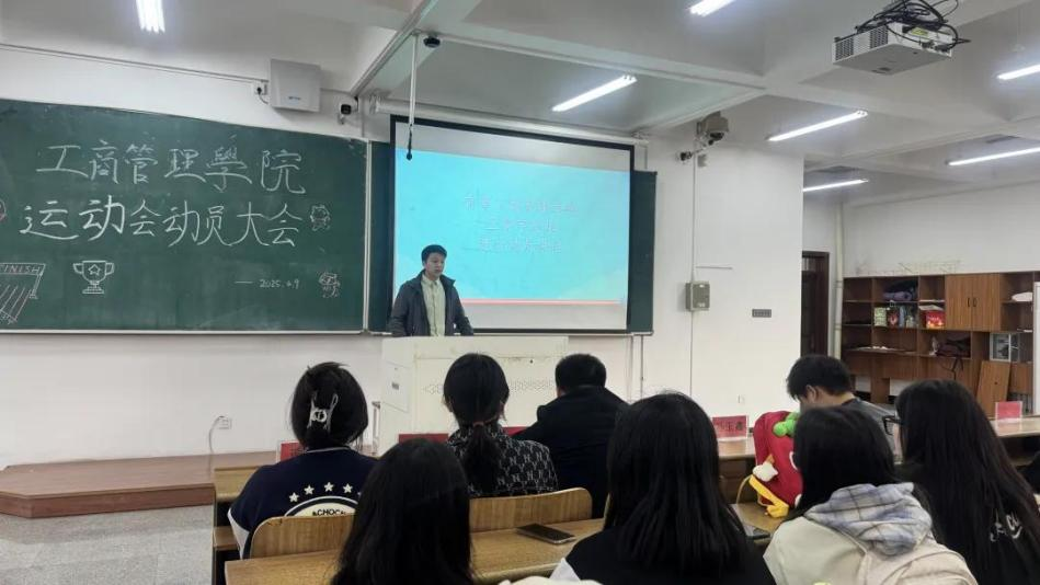 为激发学生参与热情,营造积极向上的体育氛围,4 月 9 日下午,九洲官方网站工商管 理学院在明德楼 D308 召开校运会动员大会。学院党委副书记汪若水、2024 级辅导员王晨宇 及学生代表出席会议,共同为即将到来的校运会加油鼓劲,倡导以拼搏精神书写青春篇章。