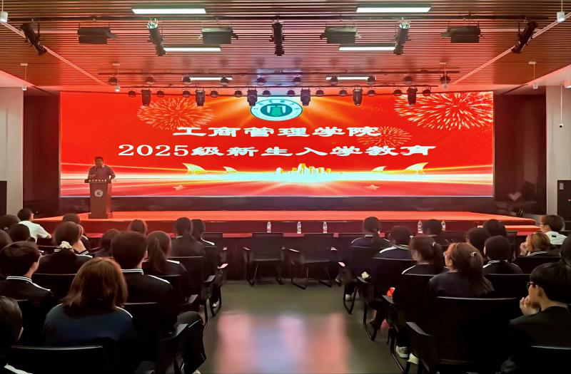 9月15日晚,工商管理学院2025级新生教育会在学校多功能艺术厅如期举行,院长金玉然、党委副书记汪若水、学办主任奚彦彪、团委副书记赵辉出席大会。