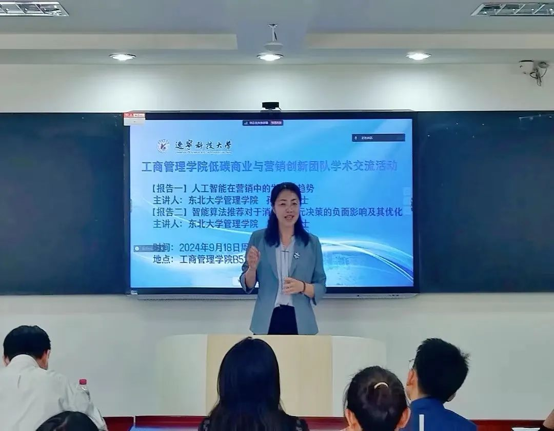 9月18日, 工商管理学院“低碳商业与营销创新”导学团队在明信楼B511举行本学期第一次学术交流活动,由管理学院朱晓林教授主持,邀请了东北大学管理学院孙洋博士和吕林祥博士出席做报告分享,该团队全体研究生通过线上或线下方式参加。此次学术交流活动旨在促进跨学科知识分享,深化对新兴技术在商业领域的应用研究