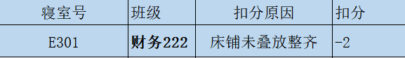 每周中午12:30,工商管理学院对全体本科生宿舍进行检查。在检查过程中发现大多数宿舍能够保持整体干净整洁,不乱扔垃圾,桌面摆放整齐,对这些优秀宿舍给予表扬。也有一些寝室内务卫生方面有待加强。现将检查结果公示如下: