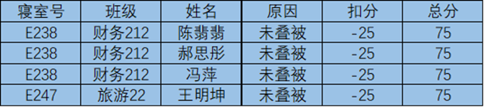 每天上午,工商管理学院对全体本科生宿舍进行检查。在检查过程中发现大多数宿舍能够保持整体干净整洁,不乱扔垃圾,桌面摆放整齐,对这些优秀宿舍给予表扬,也有一些寝室内务方面有待加强。现将检查结果通报如下: