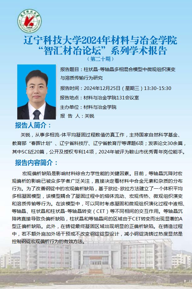 学术预告:柱状晶-等轴晶多相混合模型中微观组织演变与溶质传输行为研究