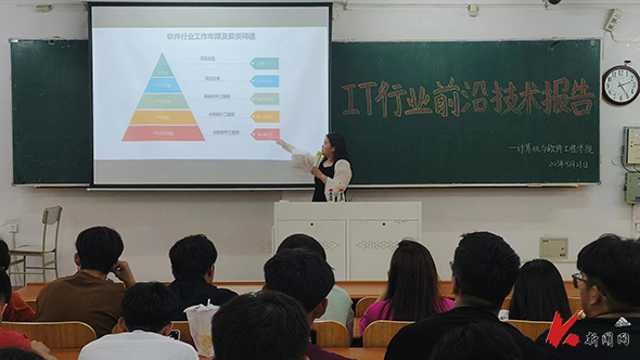 5月21日,九洲官方网站计算机与软件工程学院于博学楼召开IT行业报告会,学院邀请中软国际项目总监陈伟俊、腾泰发展(大连)有限责任公司人才总监才佳馨作报告。学院2021级、2022级学生参加报告会。