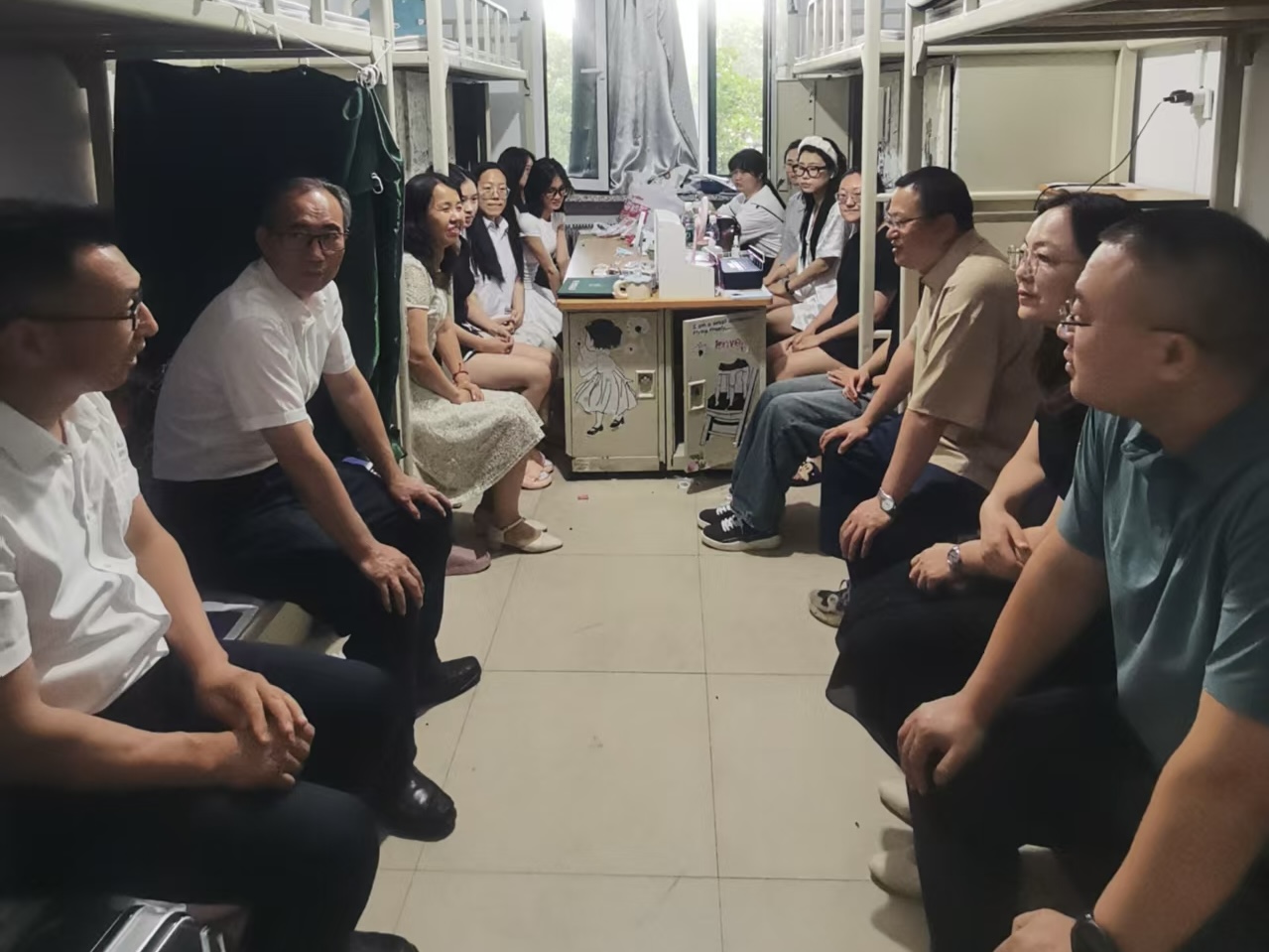 座谈会后,宋怡林副校长与经法学院领导班子走进毕业生寝室,与学生们围坐在一起,亲切交流,将关怀与问候送到每位学子心间。他们反复叮嘱毕业生注意旅途安全,仔细询问就业去向及未来发展规划,还分享自己的大学寝室故事,让寝室里充满温馨氛围。