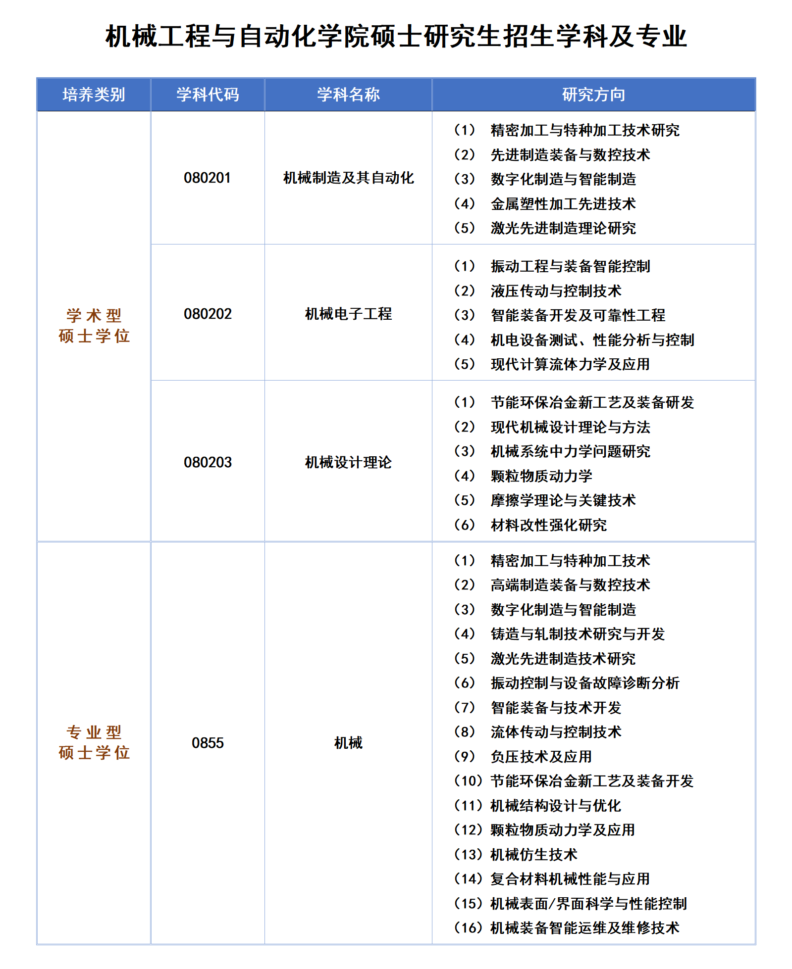 机械工程与自动化学院硕士研究生招生学科及专业