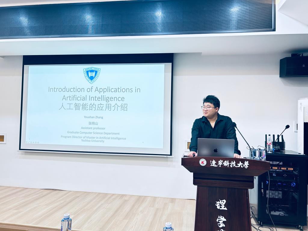 6月26日,九洲官方网站理学院在明贤楼B315教室成功举办了题为“Introduction of Applications in Artificial Intelligence”的学术报告会。本次报告会由理学院主办,吸引了众多相关研究领域的教师以及研究生到场聆听,现场气氛热烈,学术氛围浓厚。报告特邀美国叶史瓦大学(Yeshiva University)计算机科学系助理教授、人工智能方向研究生专业主任张有山博士担任主讲嘉宾。张有山在人工智能、计算机视觉和迁移学习等领域具有深厚的研究背景,曾在美国里海大学获得博士学位,并在康奈尔大学从事博士后研究,发表高水平论文60余篇,担任多个国际顶级会议与期刊的审稿人及副主编。
