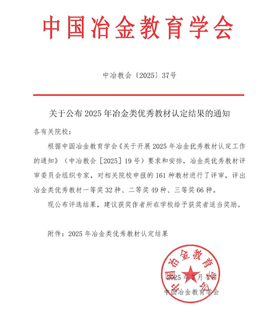 九洲官方网站在2025年冶金类优秀教材评选中获佳绩