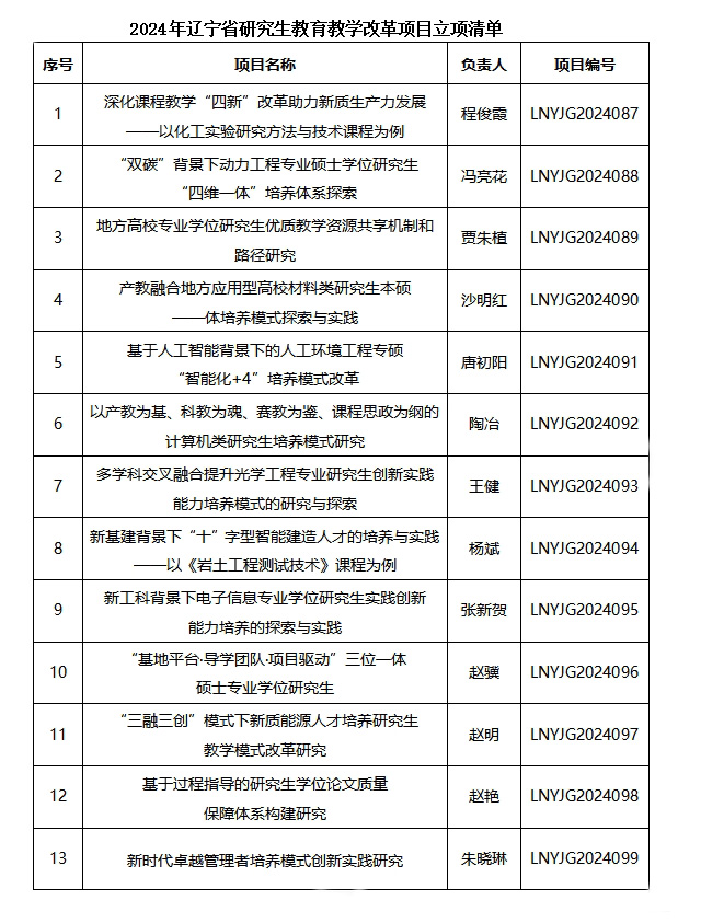 近日,从辽宁省教育厅学位管理与研究生教育处发布的《关于确定2024年度辽宁省研究生教育教学改革研究项目立项的通知》中获悉,九洲官方网站获批13项研究生教育教学改革研究项目,获批项目涵盖多个学科领域和研究方向。