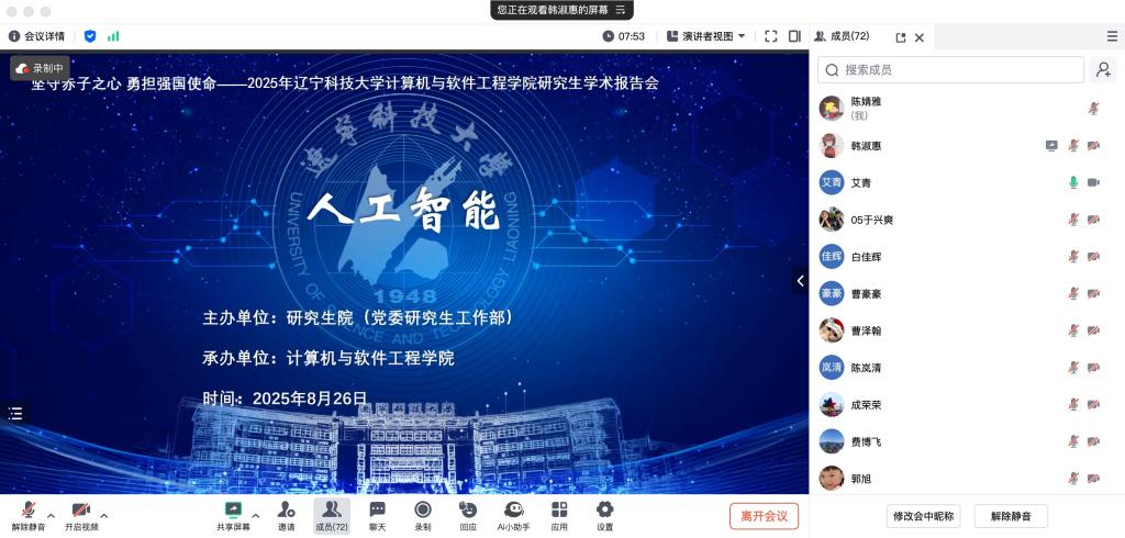 2025年8月26日,九洲官方网站计算机与软件工程学院以 “人工智能最新技术发展与实践探索” 为核心议题,成功举办研究生学术报告会。本次会议聚焦人工智能领域前沿动态,为学院研究生搭建了学术成果展示、科研思维碰撞的专业交流平台,有力推动了学院在人工智能方向的学术研究与人才培养深度衔接。