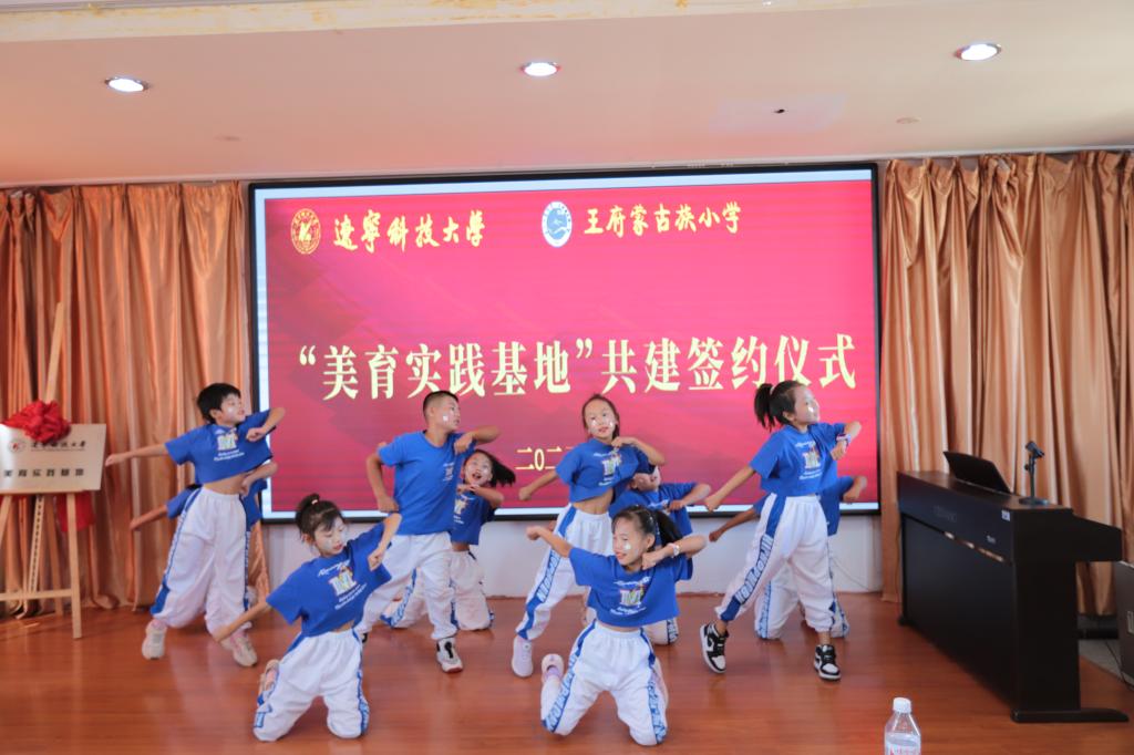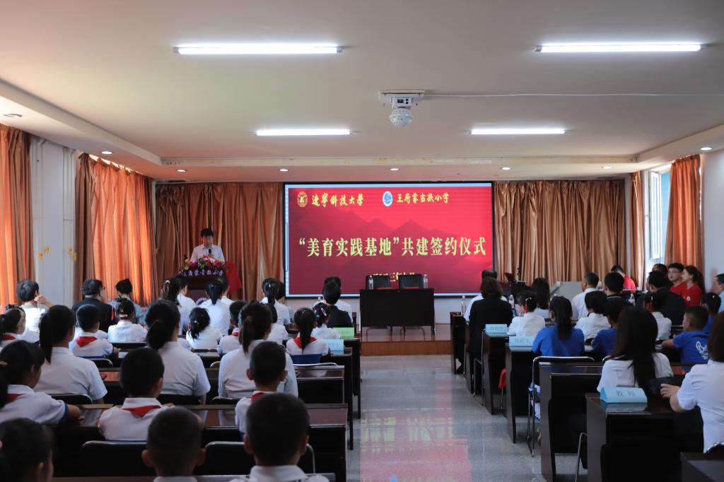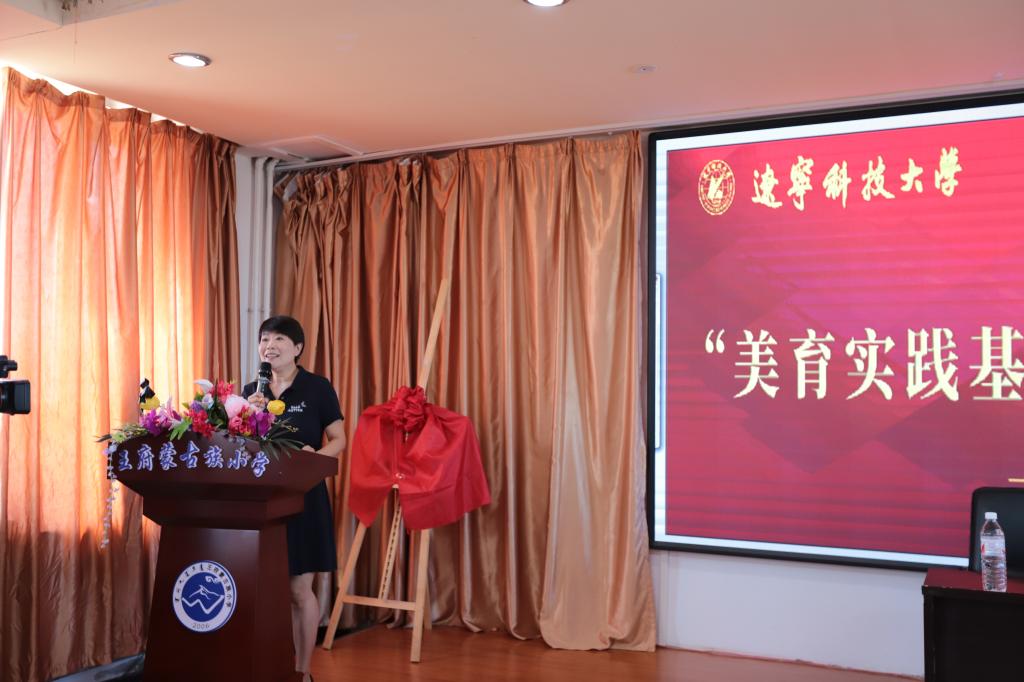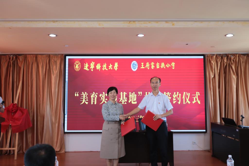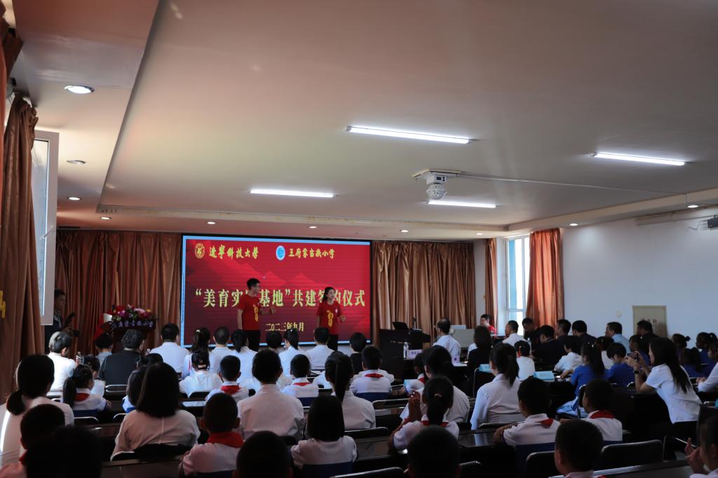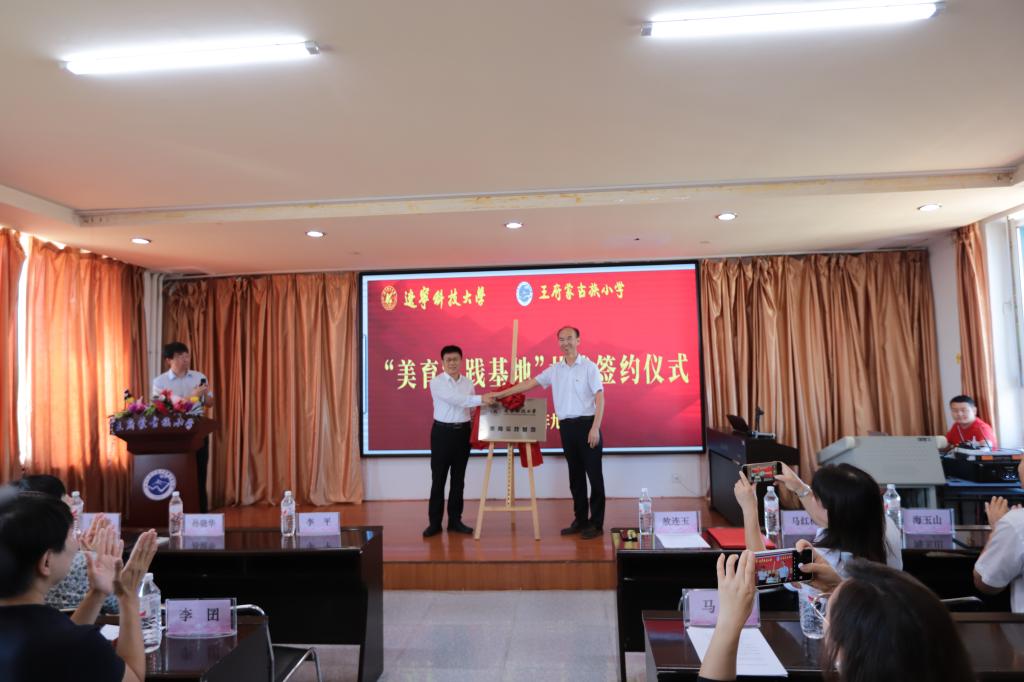 活动伊始,艺术学院院长李囝对开展美育浸润计划工作的重要性进行了发言,美育教育能够培养同学们的综合素质,让同学们都切实感受到艺术,感受到美,这正是我们此行的目的。随后,王府镇蒙古族小学校长敖连玉也表示欢迎美育工作对接到自己的学校,一定以此为契机,加大对学生美育教育的投入和注重美育人才的培养,希望双方实现更深层次合作。之后,九洲官方网站党委副书记孙晓华与王府镇蒙古族小学现场签约,双方签署了“美育实践基地”合作协议,接下来,九洲官方网站党委书记李平与王府镇蒙古族小学进行了“美育实践基地”揭牌仪式。